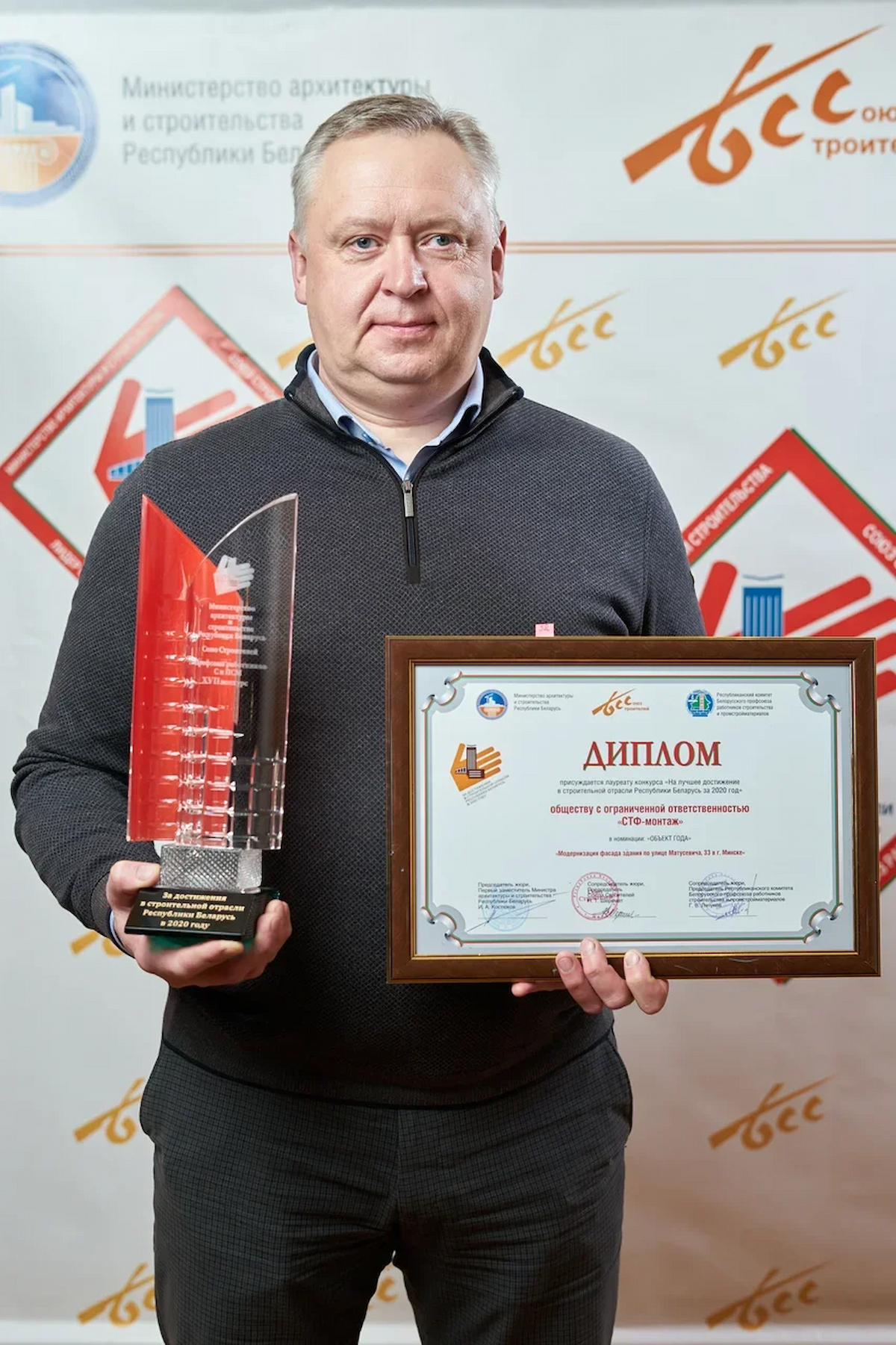 В 2021 году наша компания стала победителем в ежегодном республиканском Конкурсе «На лучшее достижение в строительной отрасли Республики Беларусь за 2020 год» в номинации "ОБЪЕКТ ГОДА" (Модернизация фасадов здания по ул. Матусевича, 33 в г.Минске).
